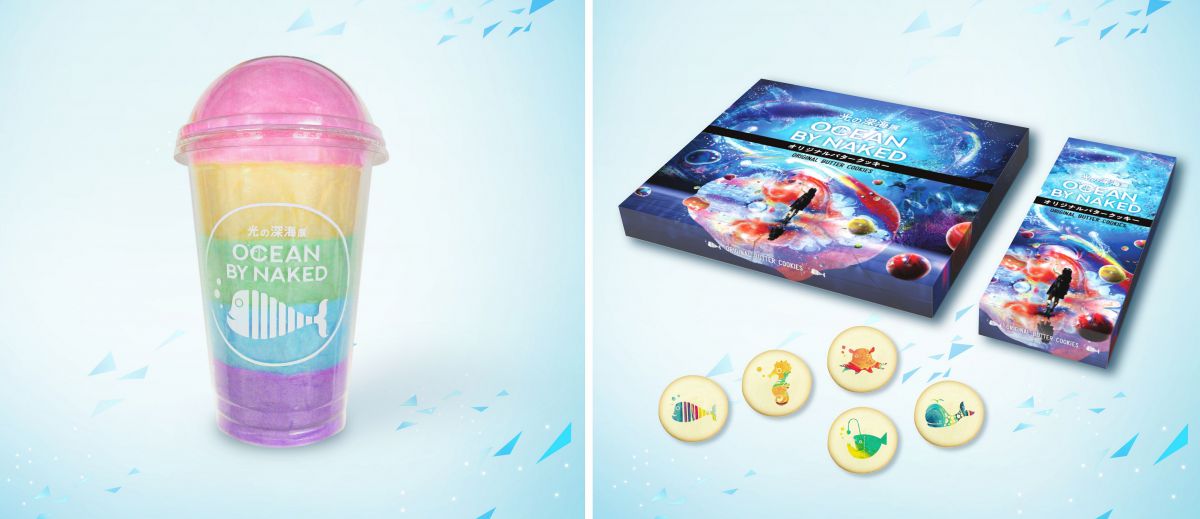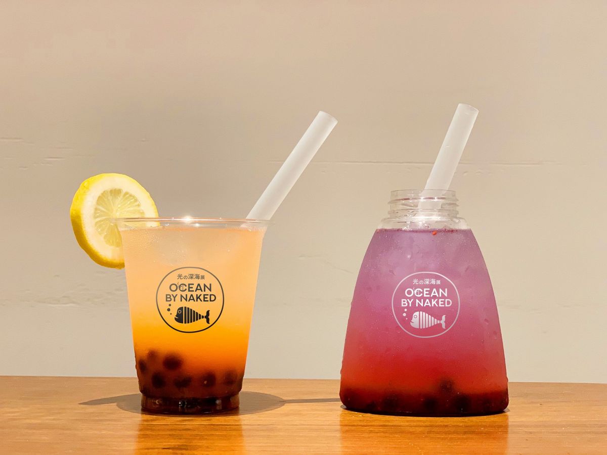 1階カフェと2階「OCEAN BY NAKED 光の深海展」物販エリアでは、タピオカドリンクを販売。