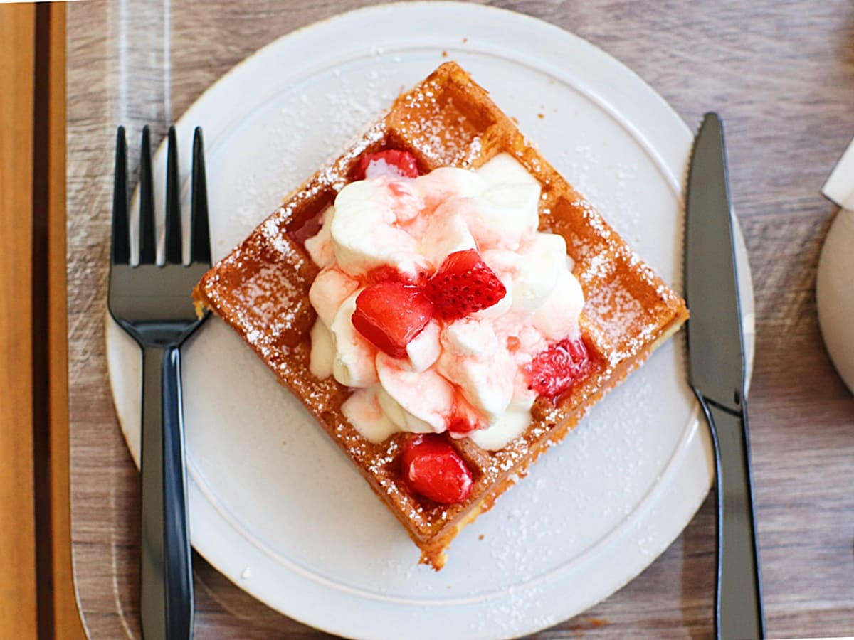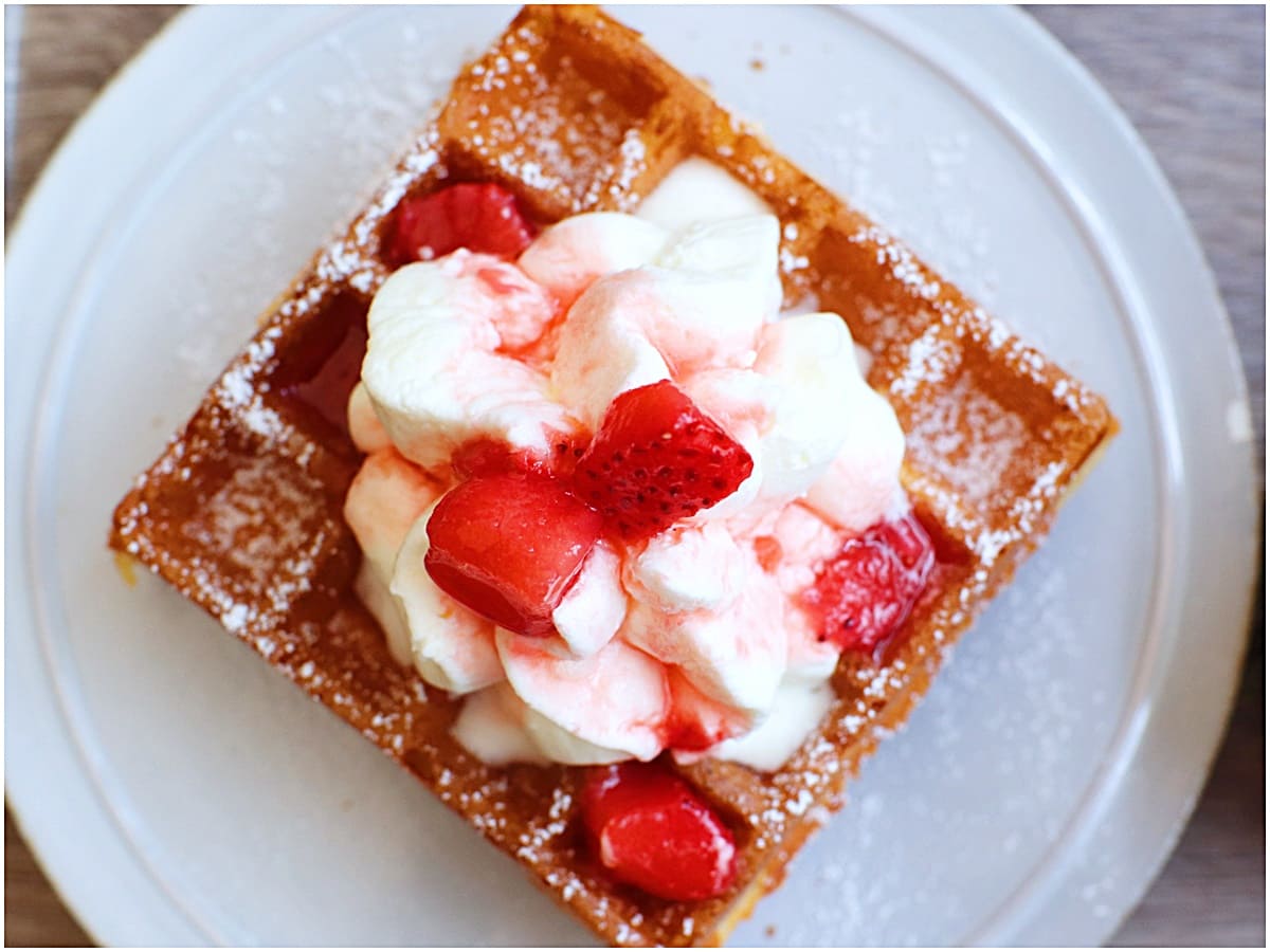 香ばしく焼かれたワッフルの上には、クリームと果肉たっぷりのいちごのソースが。