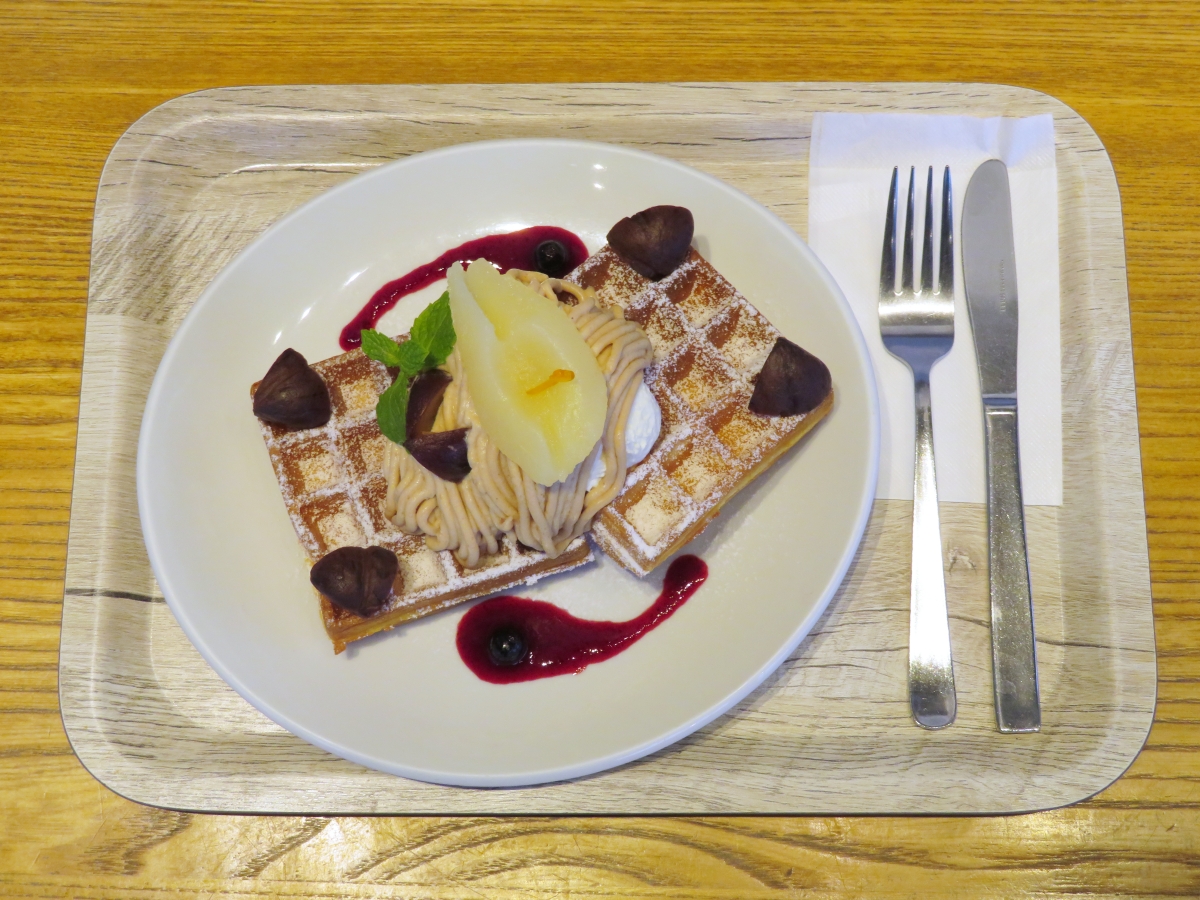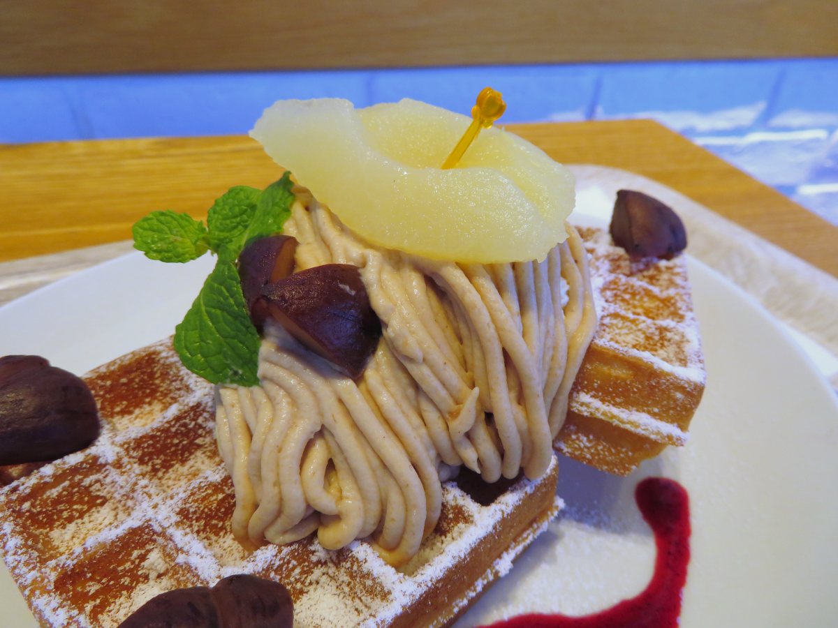 現在の限定メニューは「洋梨とカシスのモンブランワッフル」691円(税別)/ドリンクセット 946円(税別)。
