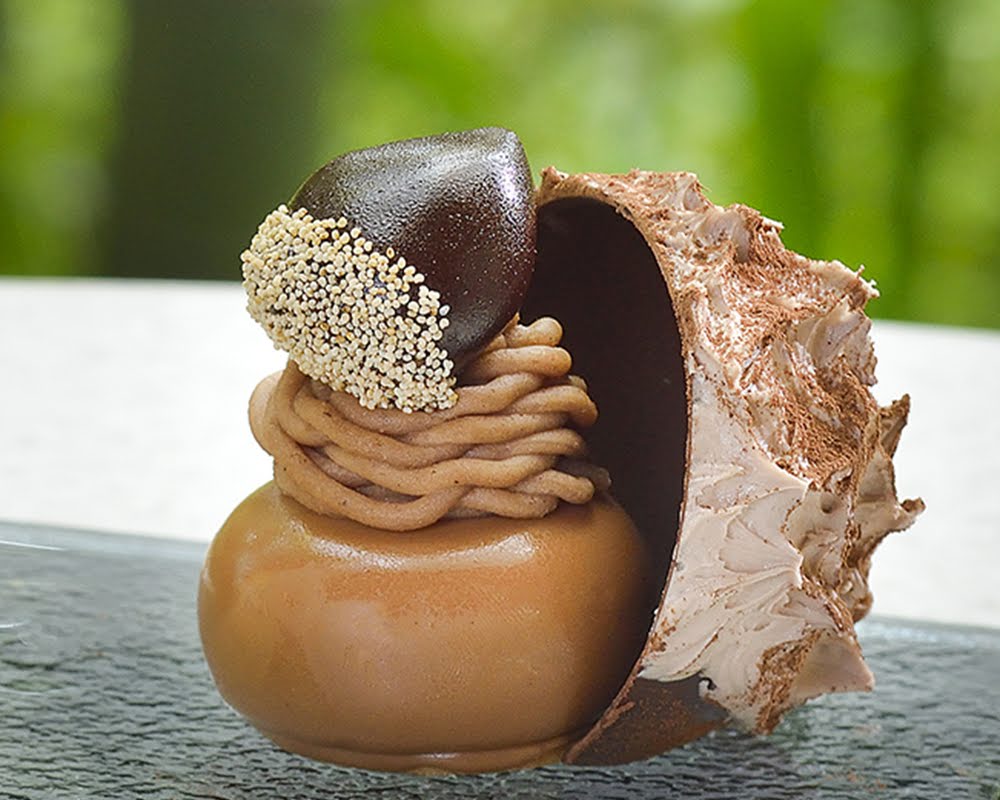 栗と洋梨のカタラーナは、和栗と洋栗の2種類を使用。中に洋梨のキャラメリゼが隠れており、見た目も可愛い一品です。