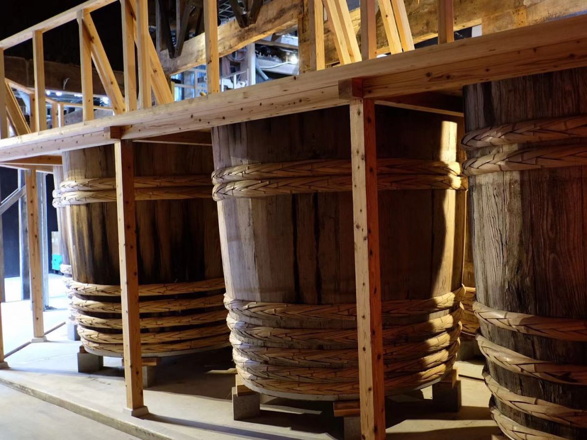 蔵の中心部には、醤油のもとになる“もろみ”が詰まった巨大な仕込み桶があり、そばに近づくと醤油の香りが漂ってきます。こうした昔ながらの木桶での醤油作りをしている醤油メーカーは少なく、間近で見られる場所は現在では貴重です。