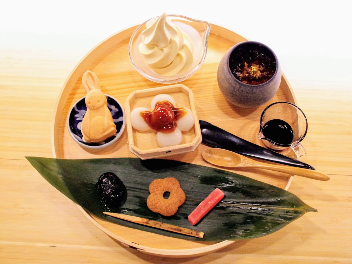 うさぎカフェで一番人気のメニューは、浜田醤油の醤油も使った和のスイーツが一度に何種類も味わえる「スイーツ盛り合わせ」(1320円・税込)。醤油ソフトクリーム・お月見団子・甘酒ぷりん・お多福豆・和菓子が、まるいお盆にずらりと並んだ贅沢なメニューです。