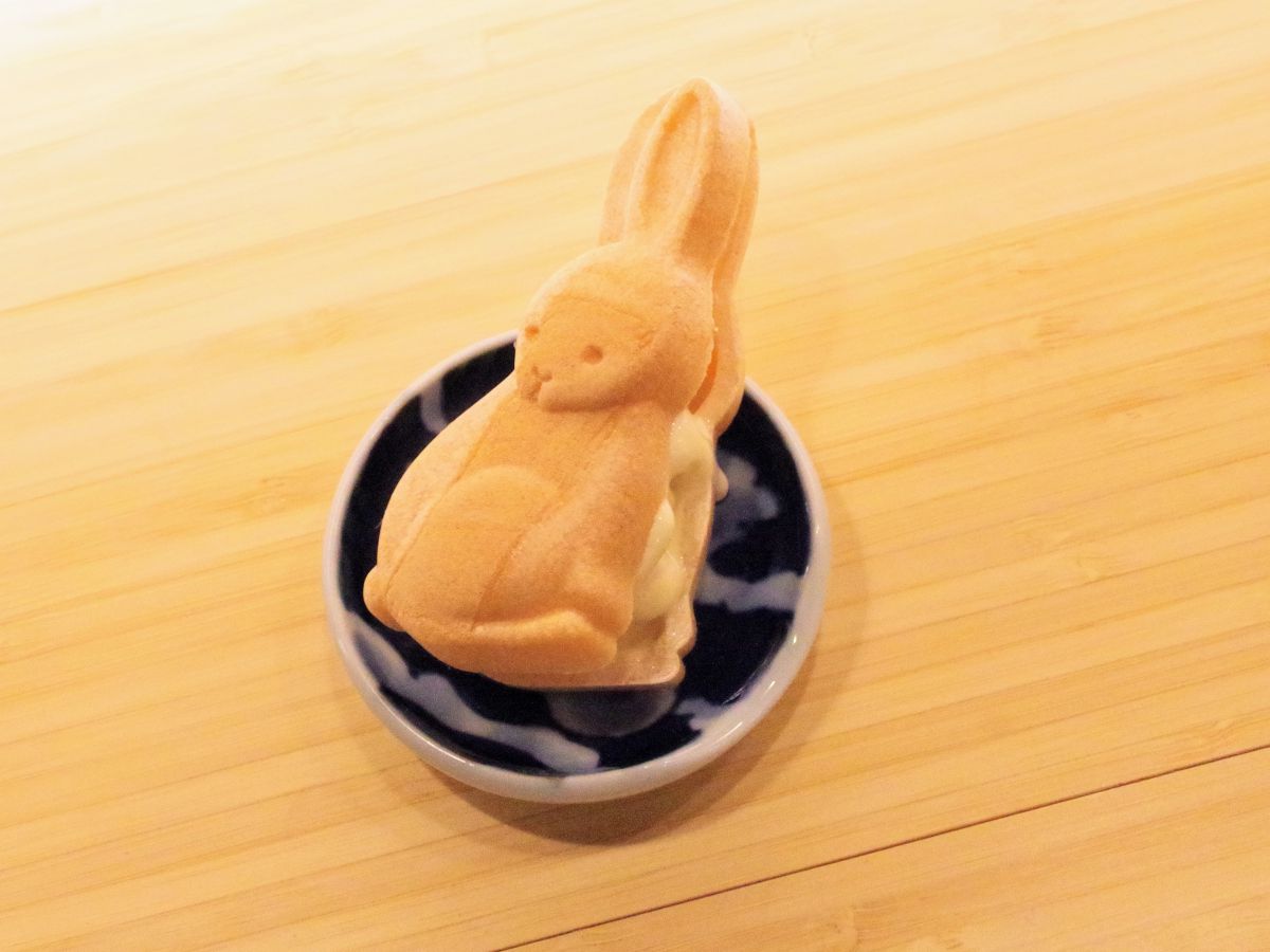 お盆の端っこにちょこんと添えられたうさぎ最中は、醤油ソフトクリームを挟んでいただきましょう。醤油ソフトクリームには浜田醤油の醤油が使われていて、醤油の塩気とコク、ミルクの甘さが調和した、塩キャラメルのような味わいです。うさぎの形のキュートな最中はサクサクした食感で香ばしく、醤油ソフトクリームとも相性抜群。