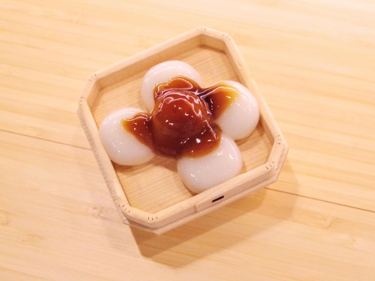 お月見団子の白玉には、熊本県小川町にある「白玉屋新三郎」の白玉が使われています。トッピングのみたらしタレは、浜田醤油の醤油を使った自家製のもの。もっちりとしてコシのある白玉と、とろとろの甘辛いタレの組み合わせは、間違いないおいしさです。