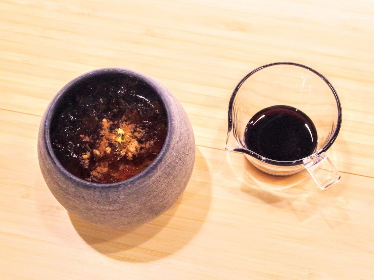 甘酒ぷりんには、別添えの黒みつをかけて食べましょう。なめらかで甘さ控えめの甘酒ぷりんに、ほうじ茶のゼリー、きなこ、金箔がトッピングされた上品な味のデザートです。