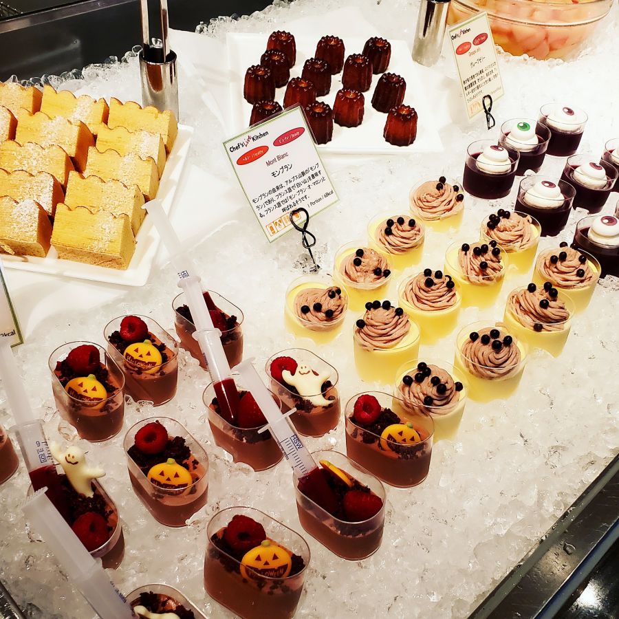 品数が多く嬉しいビュッフェですが、やはりハロウィンスイーツはぜひチョイスして下さいね。注射器の刺さったチョコレートムース、目玉が揺れるグレープゼリー、ジャック・オ・ランタンのパンプキンスフレチーズケーキ、血まみれのクレームダンジュなどテンションMAXひゃっほー! なスイーツがいっぱいです。