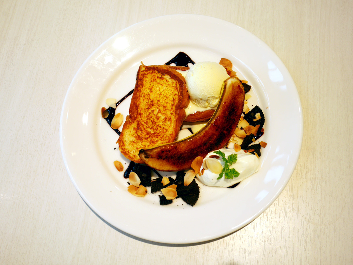 熱々のフレンチトーストと冷たいアイスクリームの絶妙なコラボ。さらに、キャラメリゼされたバナナのパリパリ、チョコクッキーのサクサクとした食感も最高のおいしさ!
