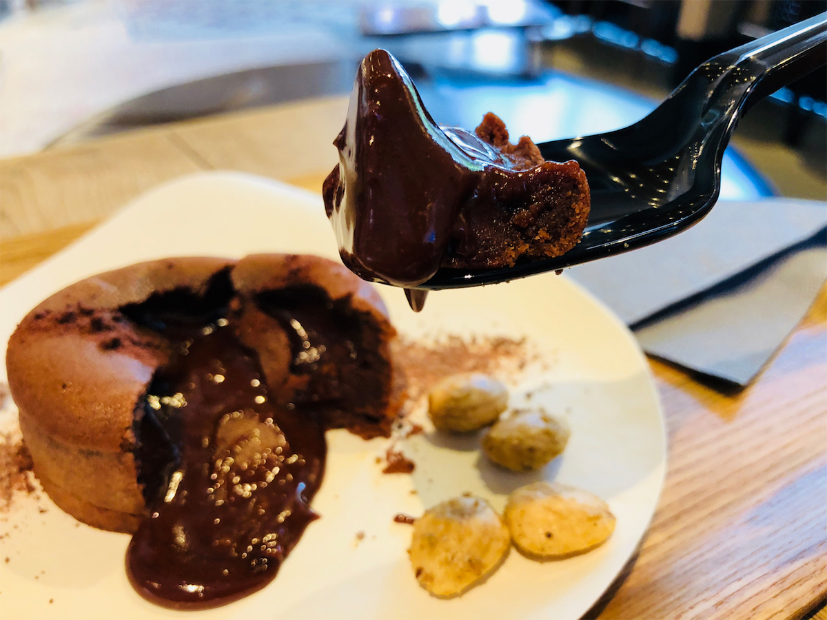 店1番の人気メニューがこの「フォンダンショコラ(486円)」。ゆっくりとスプーンを入れると…見てください、この光景!インスタのストーリーズにあげずにはいられないくらい映えてます。