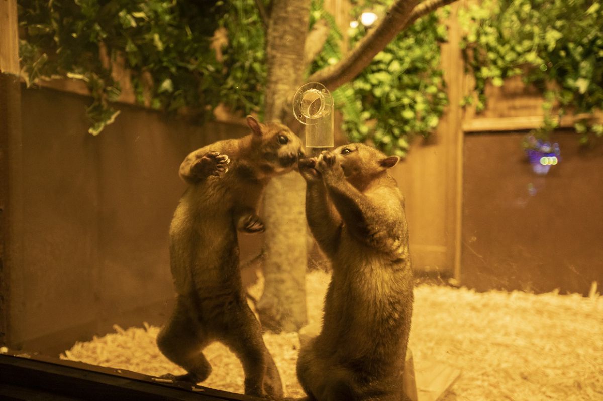 夜行性動物「キンカジュー」などとふれあえる動物エリア『イルミdeZoo』。夜はアクティブになるから、「キンカジューのボルタリング」も見られるかも。