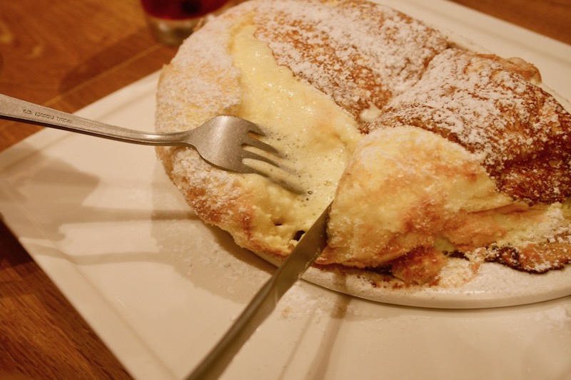 ふわふわスフレをクレープで包んで焼き上げているので、ナイフとフォークで切り込みを入れるとこの通り。