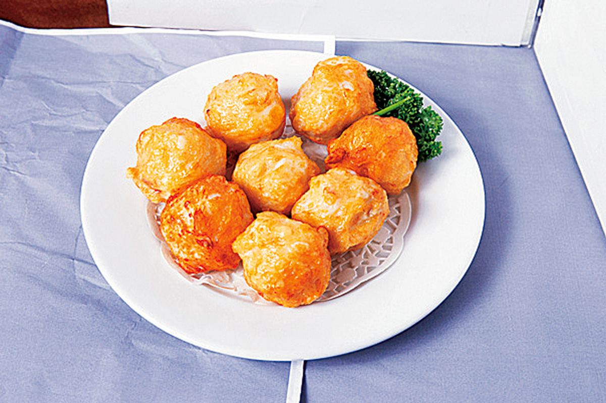 炸花枝丸NT$40/1個はブツ切りイカも練り込まれた大きなイカ団子。塩こしょうをかけて食べるとおいしさ倍増ですよ!