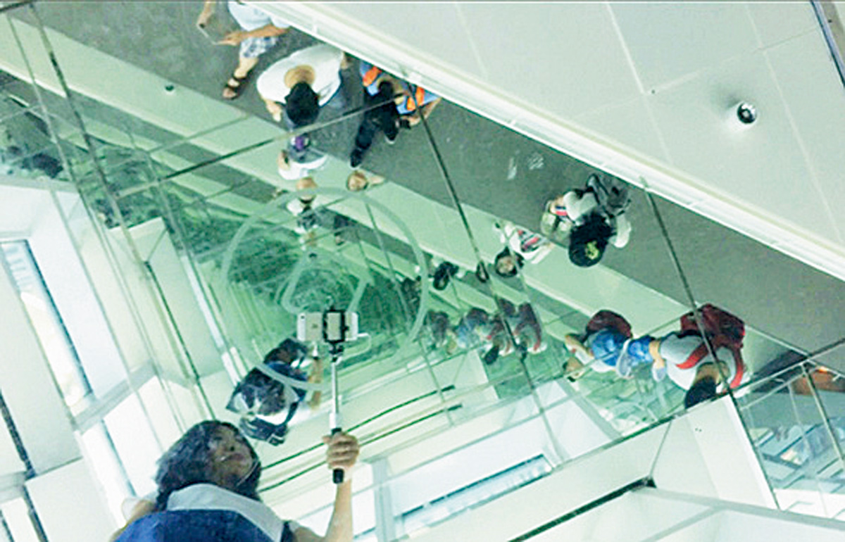 地上382mの展望台エリアへ。全面ガラス張りで眼下に広がる360度の眺めを楽しめます。全面ということは、床も?そうなんです。床もガラス張りで下が透けて見えスリル満点!さらに音声ガイド機器の無料貸し出しもあるようで、ぜひ活用しましょう。