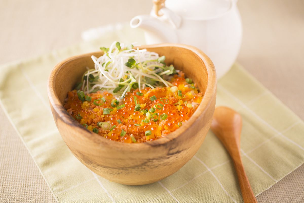 こめらくの看板メニュー「おひつごはん」は、まずそのまま丼として、次に特製かつおだしをかけてお茶漬けに、2度おいしく味わえるのがポイント。彩りあざやかな「鮭といくらの北海ごはん」や海鮮たっぷりの「漬けと中落ちの二色まぐろごはん」など、ごはんの楽しみ方が広がるメニューが並びます。