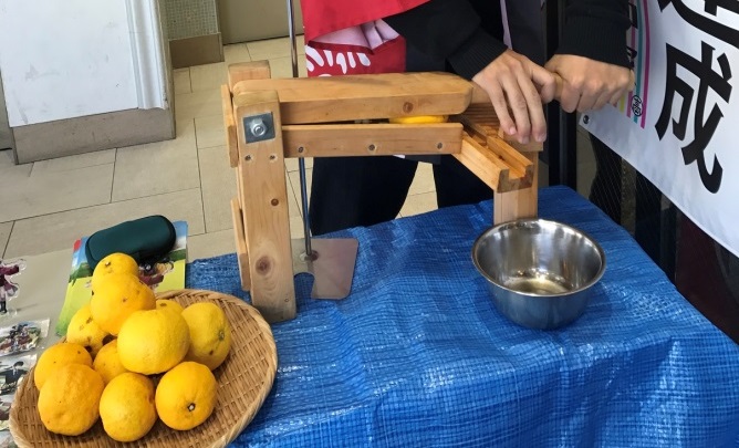 高知県内のゆずの産地近くに住む各家庭で行われていたという「ゆず搾り」。会場では、そんな「ゆず搾り」を無料で体験することができます。昔ながらの木の搾り機から、ゆずの香りがいっぱいにあふれます。