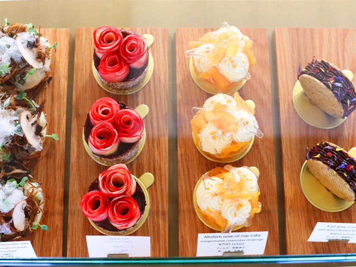 ショーケースに並ぶGabrieleシェフの作るチョコレートを用いた美しいクッキーに、坂倉加奈子シェフの作る季節の食材を活かした美しいタルトは、まるでアートのよう!