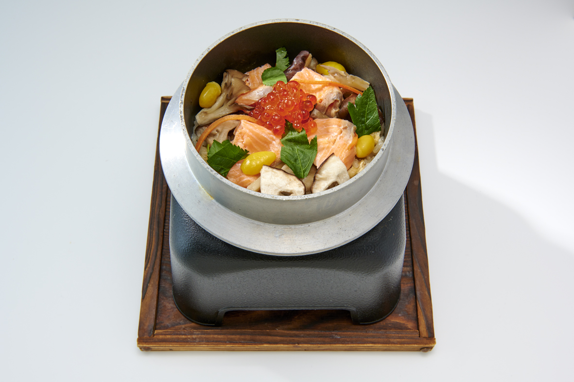 『コレド室町2』の1階「八海山 千年こうじや」では、「魚沼産きのこと八海山サーモンを使った釜飯」1100円。秋の味覚が盛りだくさんです。(提供時間:月~土17~23時、日・祝日17~22時)
