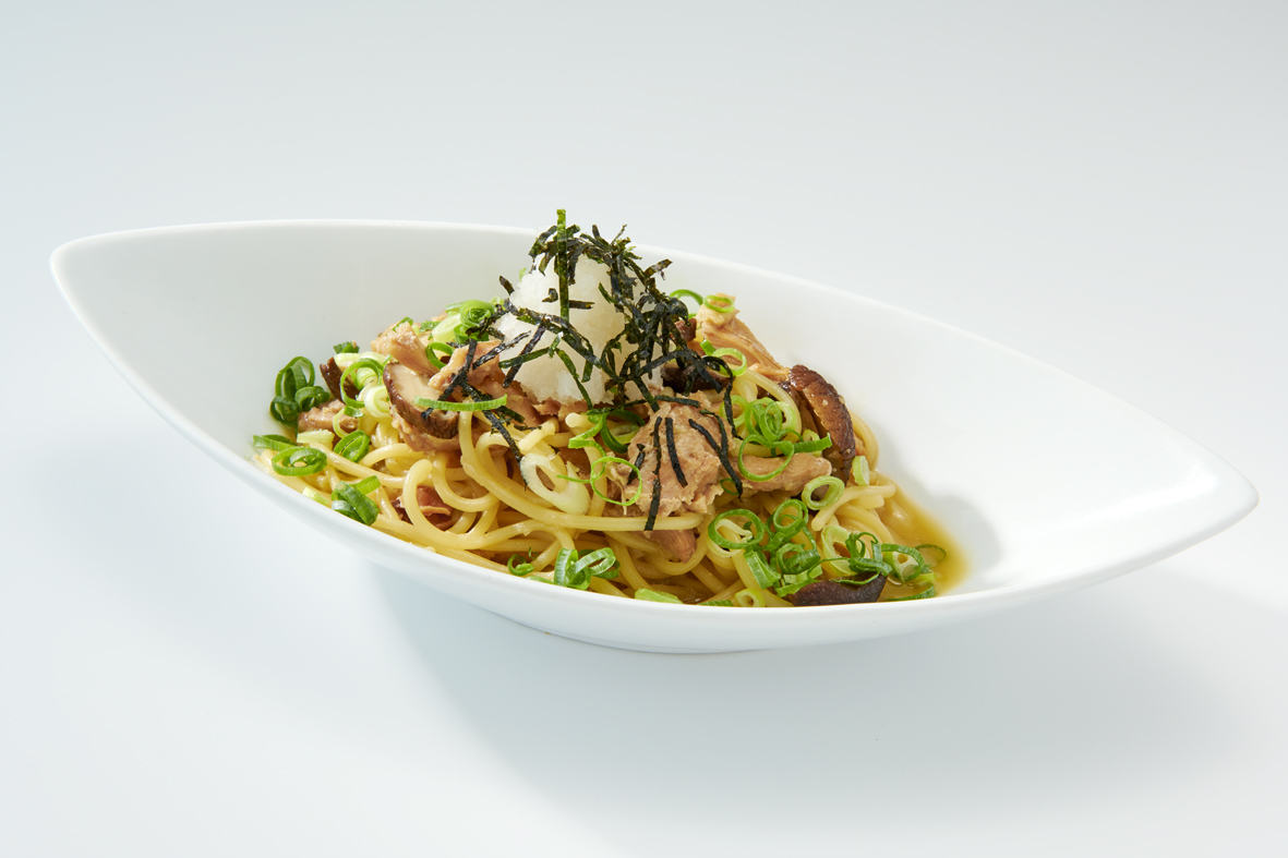 2階「SHIKOKU バル 88屋」の「松山鶏と椎茸の和風パスタ」1000円は、ふっくら炊いた松山鶏を大根おろしとさっぱり食べる一品です。(提供時間:平日17~23時、土・日・祝日16~23時)