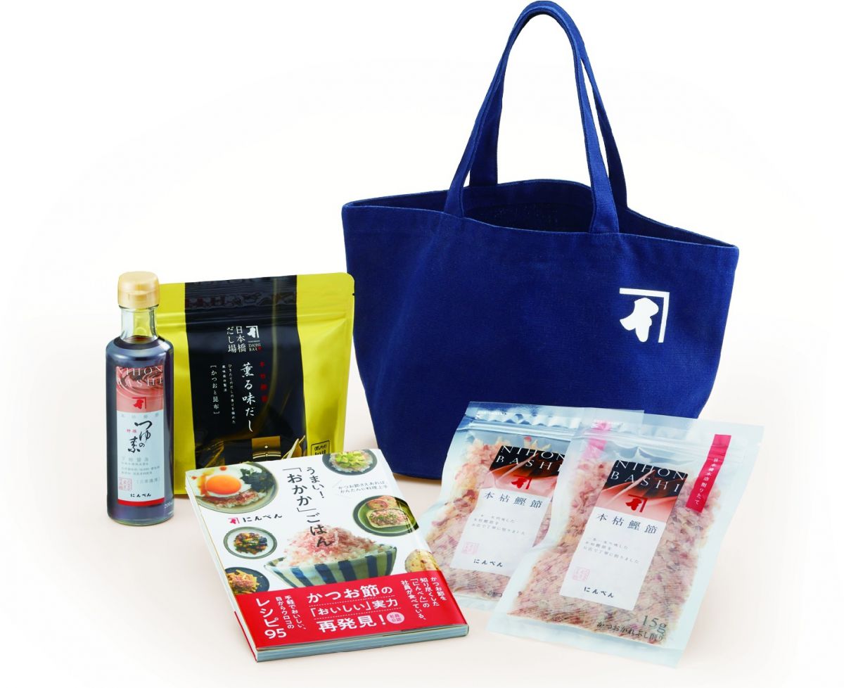 『にんべん』のオリジナルトートに入った「にんべん だし博限定セット」3000円の販売もあります。中には、本枯鰹節削りたて×2袋、本枯鰹節つゆの素特選、薫る味だしかつお昆布、社員公認レシピ本“うまい!「おかか」ごはん”が入ったバラエティーセットです。ここでしか買えないのでお見逃しなく。