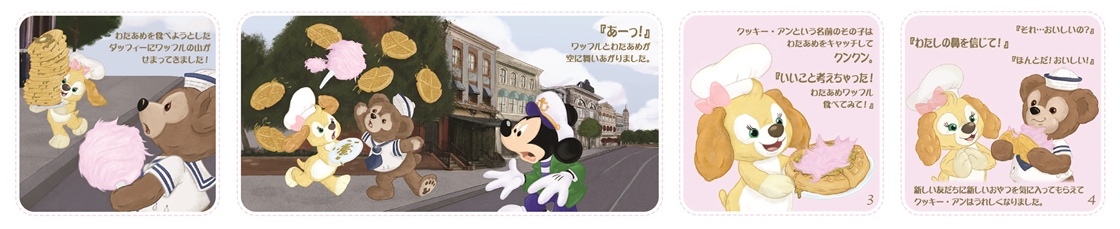 「ある日、わたあめを持っていたダッフィーに山のようなワッフルが近づいてきました。あーっ!と思ったその瞬間、手から離れたわたあめとワッフルが空を舞い、ワッフルを運んでいたクッキー・アンがキャッチ!“わたあめワッフル”ができたと喜びました。」