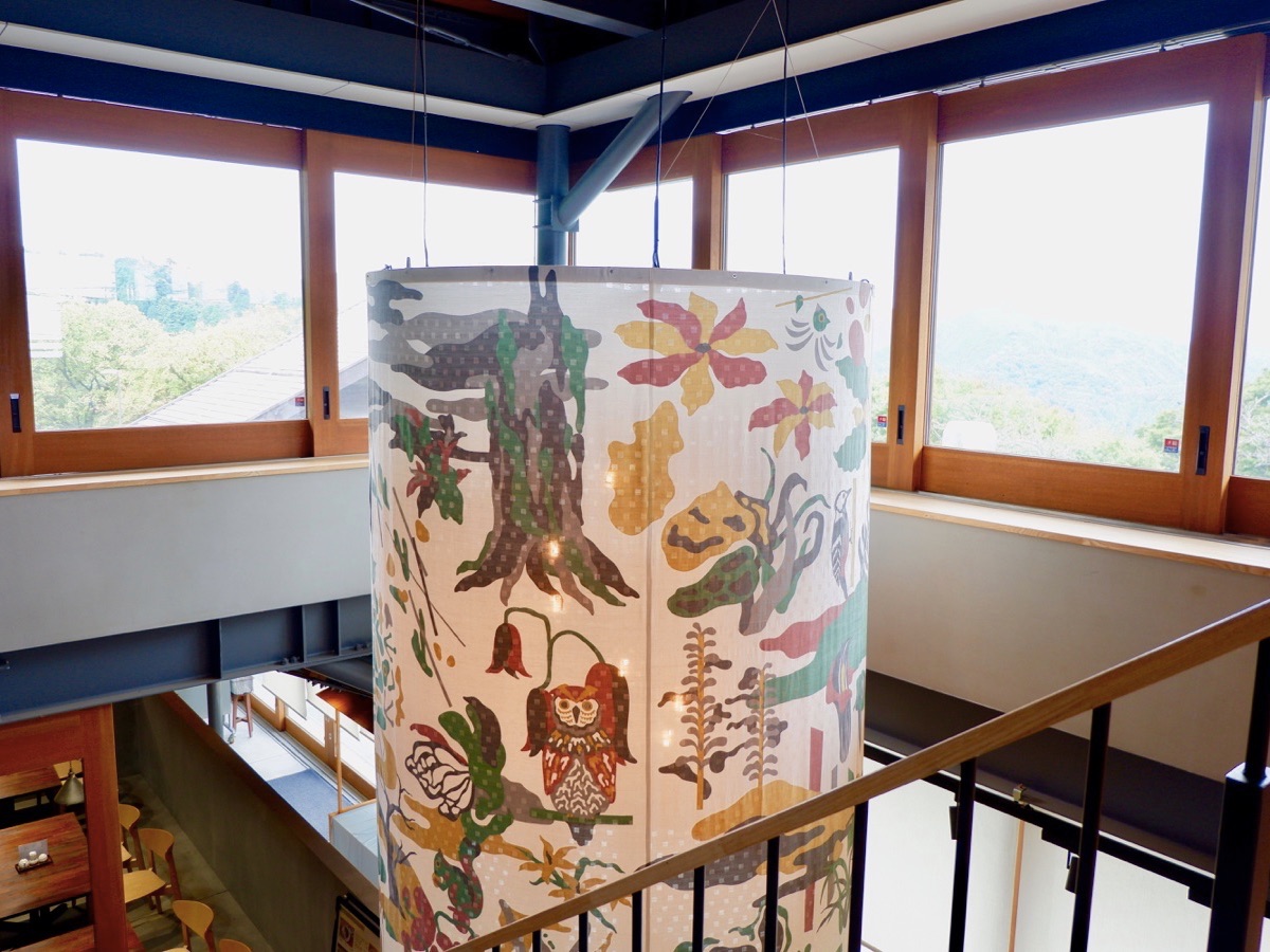 吹き抜けを彩るのは、八王子の伝統技法・多摩織で作られた直径1.7メートルの行灯「高尾山百棲図」。