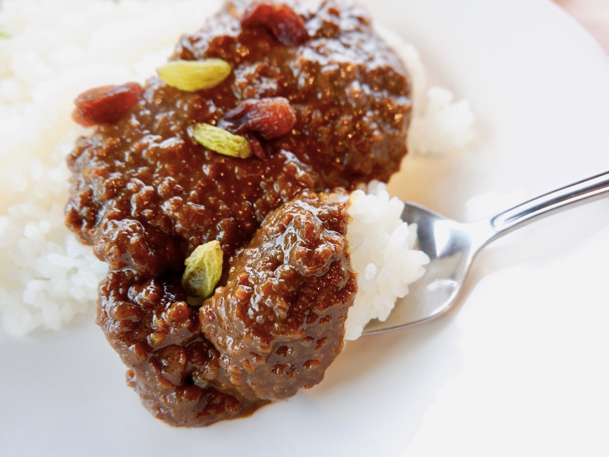 時間が経つと辛さが強まるので、付け合わせの干しぶどうやあんずジャムで味に変化を加えたいところ。