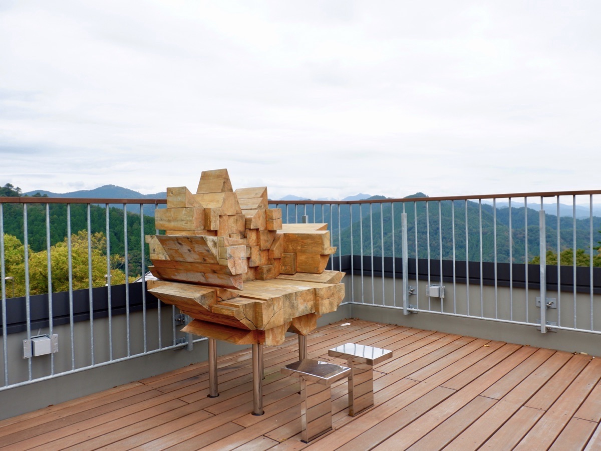 展望台で目を引くのは天狗のうちわ「ヤツデの葉」をモチーフにした、多摩産材の椅子「浮いてんぐ」。