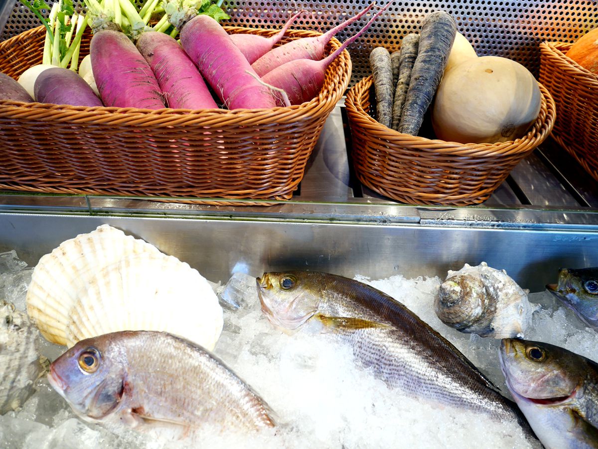 店内に入って最初に目に付くのが、お料理に使用される三浦や鎌倉の野菜、佐島漁港で水揚げされた魚介などの地元食材。