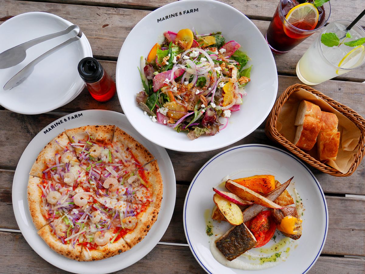 写真は人気の「漁港直送鮮魚と三崎マグロのソテー 2種の盛り合わせ」(2400円)と「MARINE & FARMオリジナル野菜ピッツァ」(1950円)。