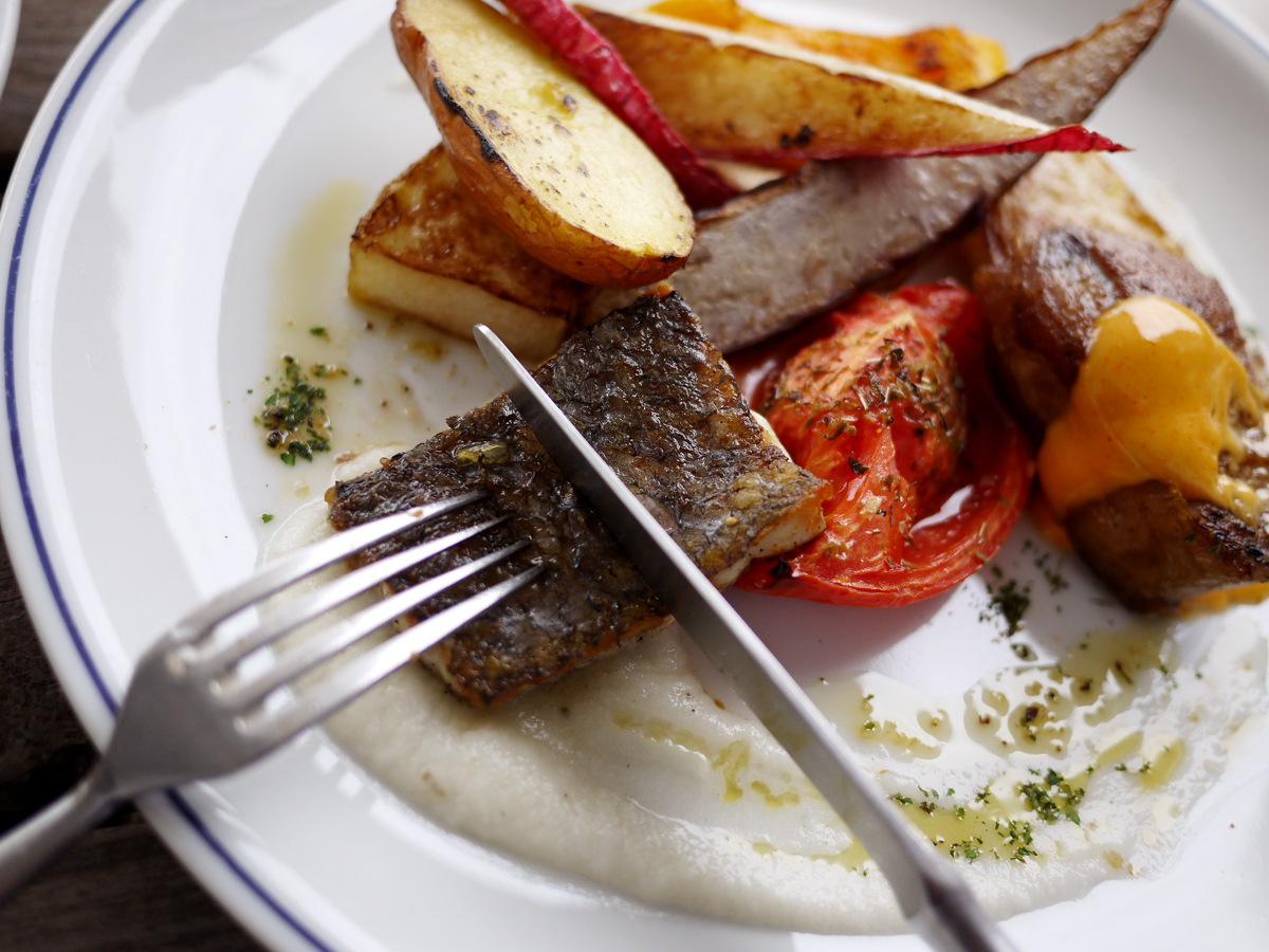 漁港から直接届く鮮魚のソテーは、野菜の素揚げとの相性もばっちり!