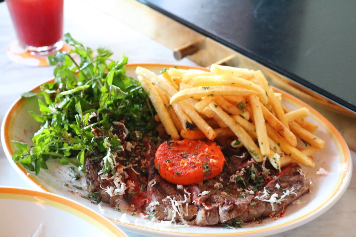 また、肉料理にサラダ、フレンチフライを一皿にした「リブアイステーキ - ローストトマトバター、フレンチフライとクレソンのサラダ添え」3900円(bills 銀座店以外で提供)もおすすめ。チリをプラスしたローストトマトバターは、程よい辛さがステーキにぴったり。くせのないフレッシュなクレソンと一緒にどうぞ。