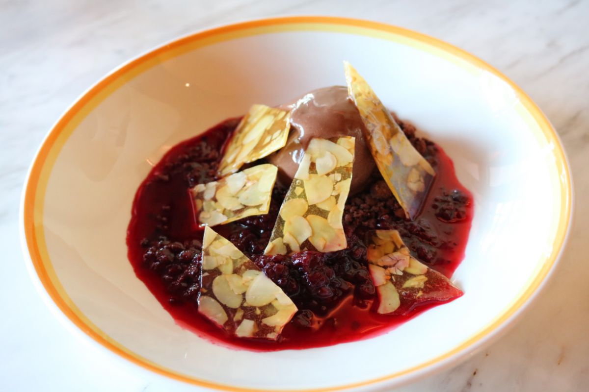 デザートはダークチョコレートソルベ - ブラックベリーソース、アーモンドブリトル1300円を。乳製品を一切使わないヴィーガンメニューとは思えない、濃厚でクリーミーなチョコレートソルベです。ダークチョコレートのほろ苦さとブラックベリーソースの酸味で甘すぎないところがポイントです。