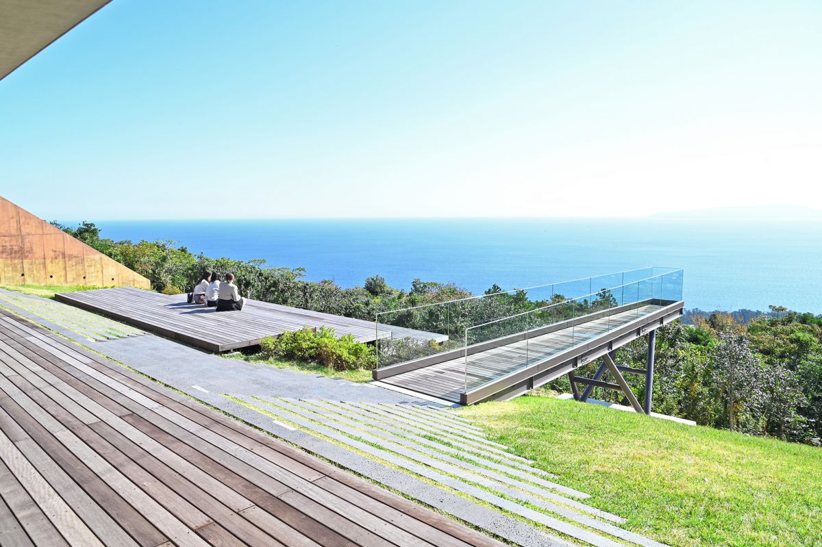 その山頂でひときわ目を惹く、地中に埋もれたかのようなデザインの建物。自然の地形を生かして造られた「Café・321(かふぇ さんにいいち)」は、まさに小室山と一体化したカフェ。屋外にある展望デッキと展望ブリッジの絶景オーシャンビューはとりわけ人気のスポットで、カフェで購入したドリンクなどをもって自由にくつろげる、カフェ利用者専用のスペースになっています。