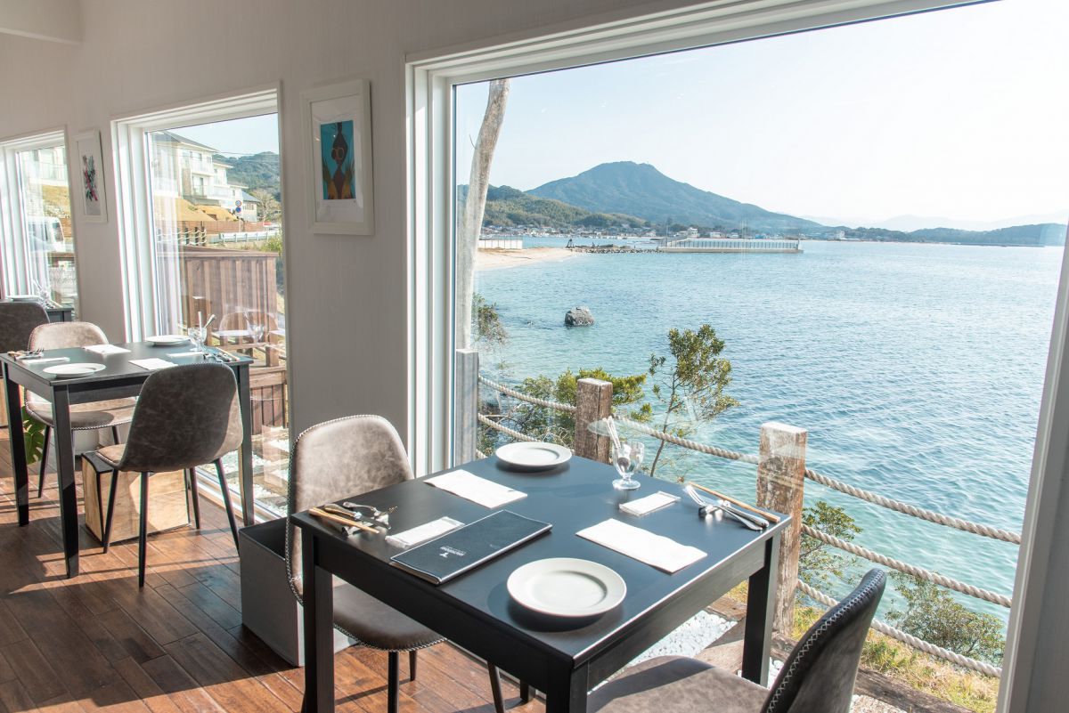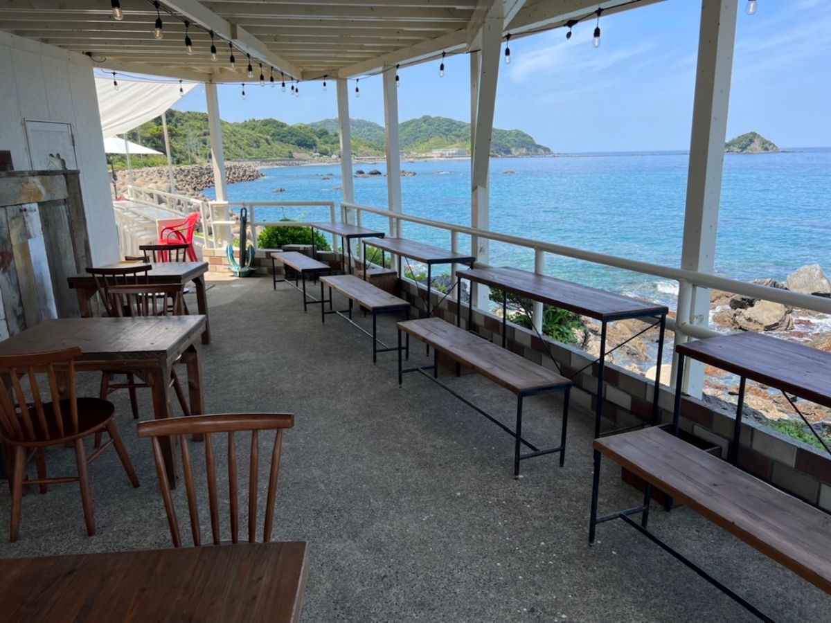 お店に入ると、目の前に海! 手が届きそうなほど近くに海があり、潮風が気持ちいいテラス席は、気候がいい日は平日でも満席に。晴れた日には、正面にくっきりと軍艦島が見えますよ。