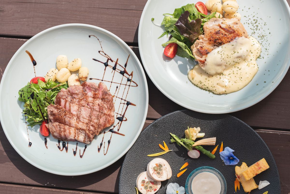 ランチタイムは、真空低温調理の肉料理をメインにした、前菜5種盛り、旬菜ポタージュ、メインディッシュ(牛または豚または鶏)、パン、デザート、食後のドリンクが付いたランチコース2500円~と、アラカルトが味わえます。また、カフェメニューは終日利用可能。