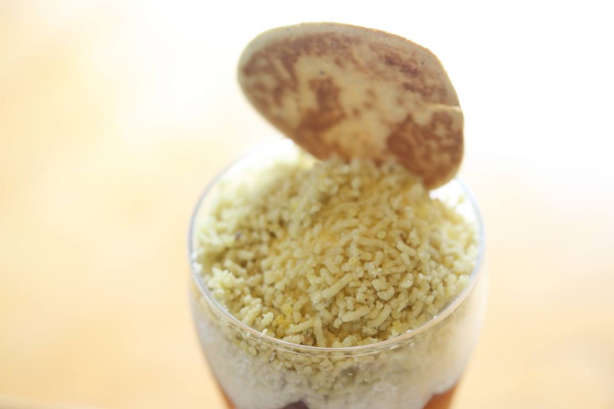 パフェのトップを飾る粒々は、栗きんとんをこしたもの。栗きんとんとは異なる「ほこほこ」とした食感が楽しめます。