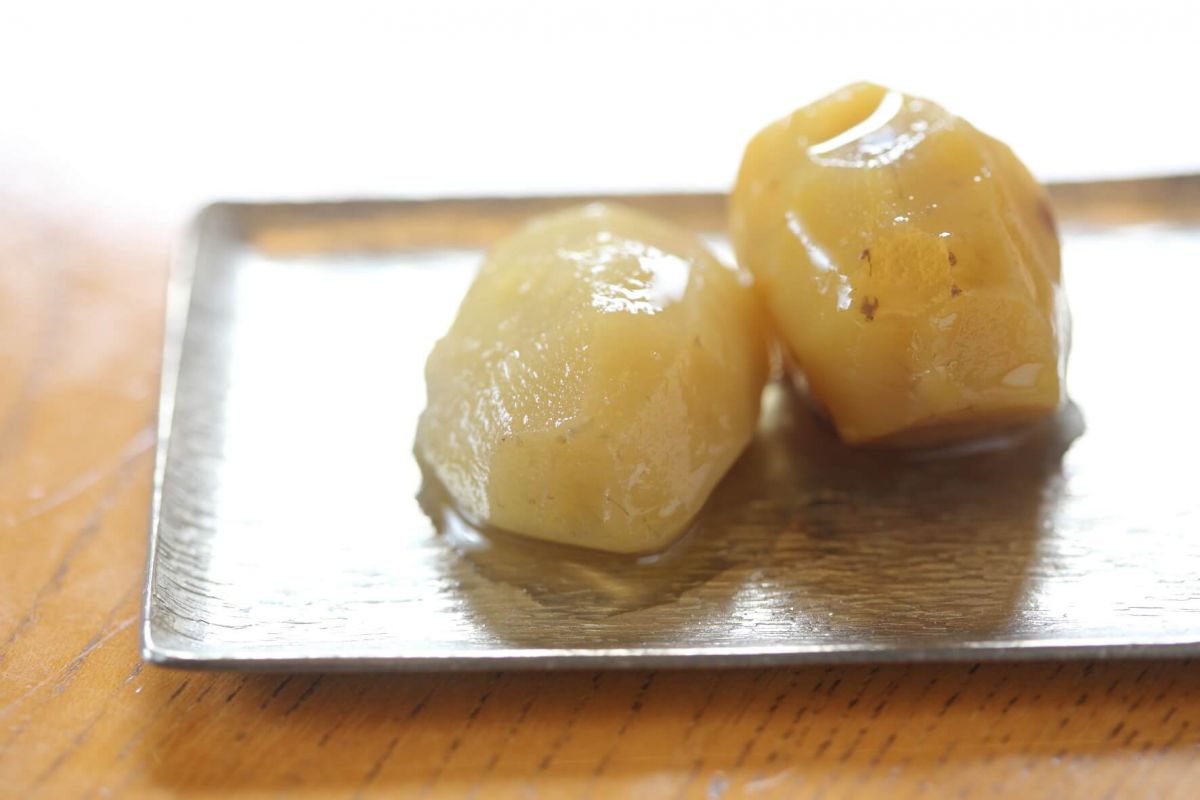 店内で食べる栗きんとんは格別! しぼりたてだから、よりしっとりとした食感が楽しめます。ちなみに、おみやげ用のものより約1.5倍も大きいんですよ。