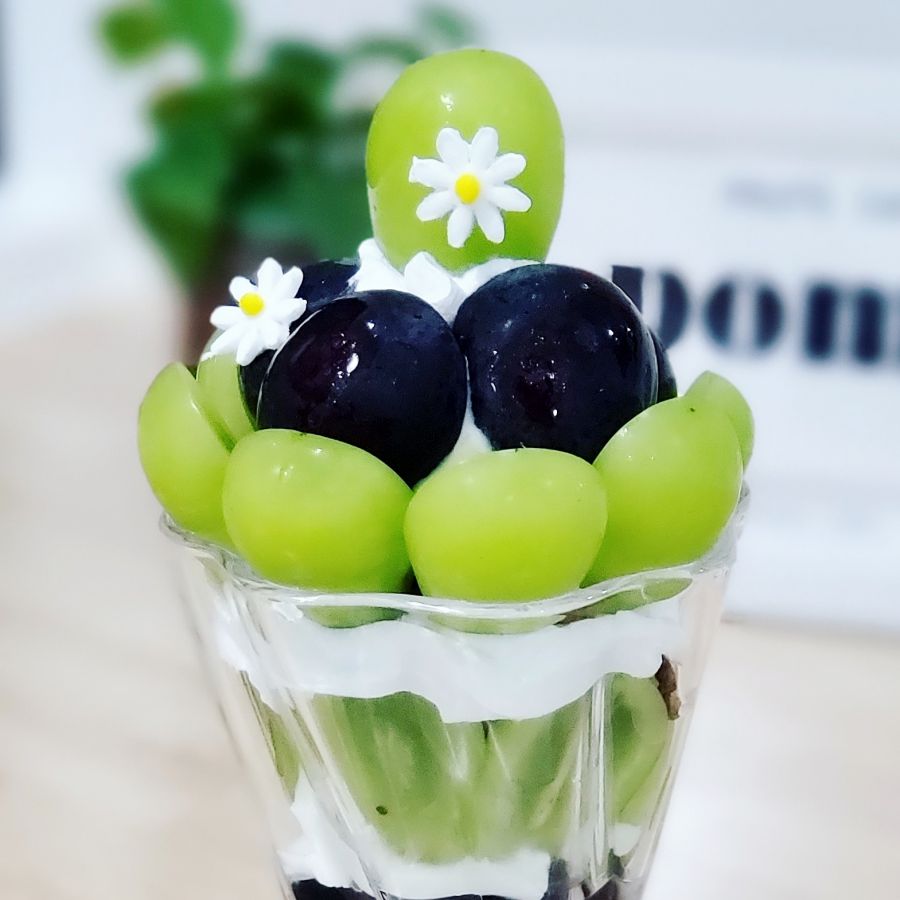 その2種類を一緒に味わえる贅沢すぎるパフェ。爽やかな甘みのシャインマスカットと濃厚でぶどう感の強いナガノパープルでウマウマ倍増にゃー♪