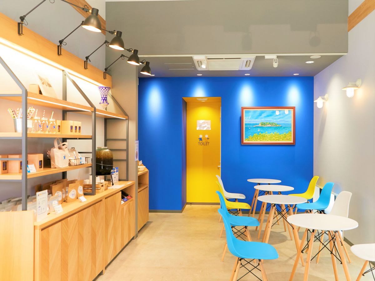 プリンが一堂に会すショーケースの隣には、テーブル席のほかに、スタンディングコーナーを備えたイートインスペースが。お店のメインカラーであるブルーとイエローを使ったポップな色使いの空間です。