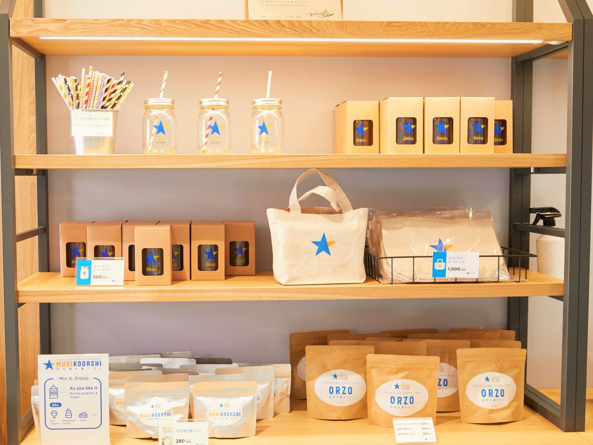ジャーボトルやミニサイズのトートバッグなど、ここでしか手に入らないオリジナルグッズのチェックも抜かりなく! 「江の島プリン」や「江の島プリン オルゾ」に用いられている「麦こがし」も、ここで販売しているので気になる人は自宅用にぜひどうぞ!