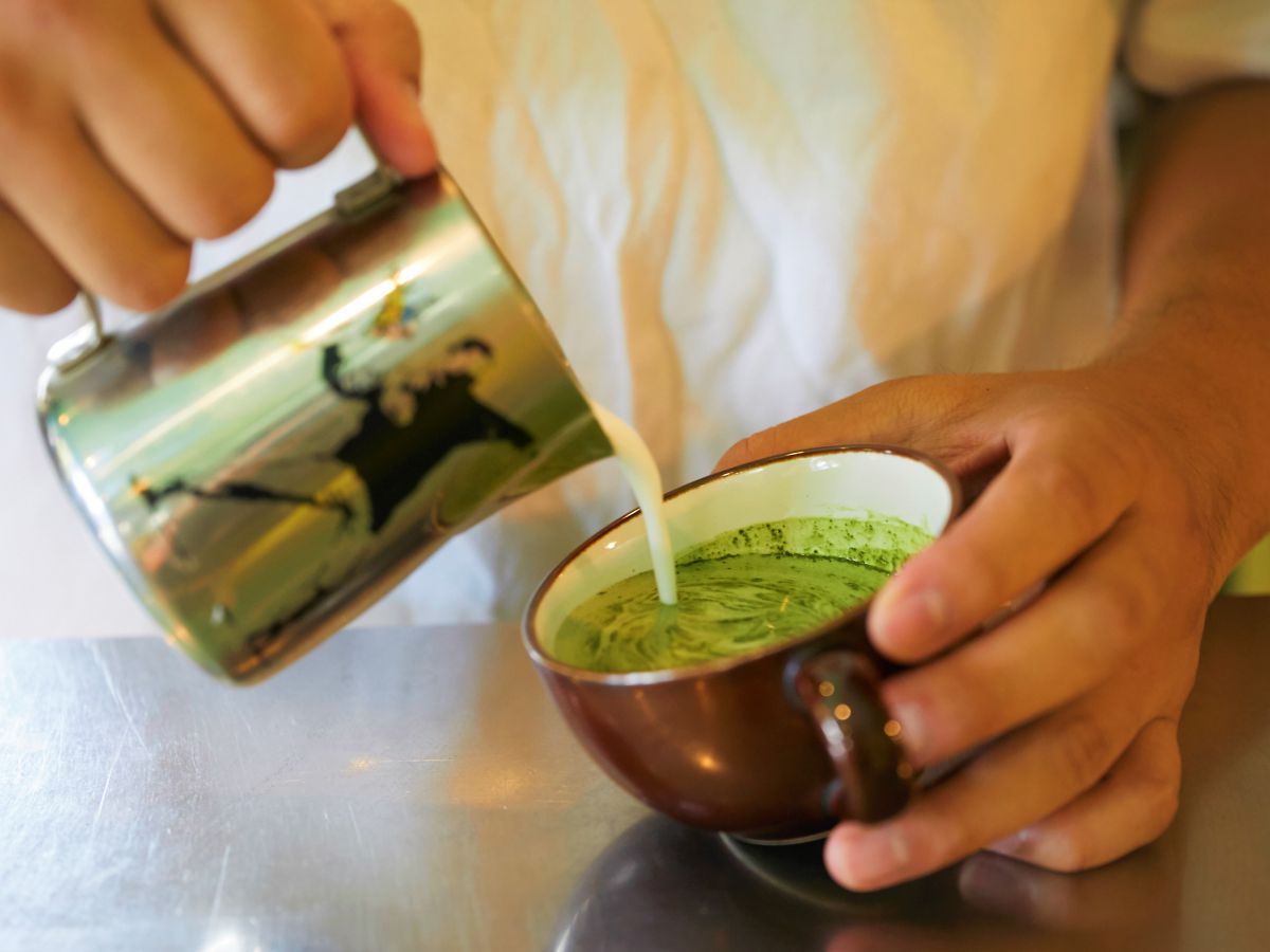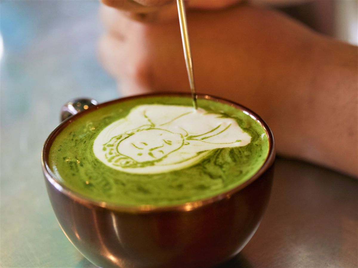 一般的な抹茶ラテは、空気を入れながら抹茶とミルクを混ぜるそうですが、空気が入ることでふわふわになると絵が描けなくなるため、できるだけ泡立てないように注ぐことをポイントにしているのだとか。