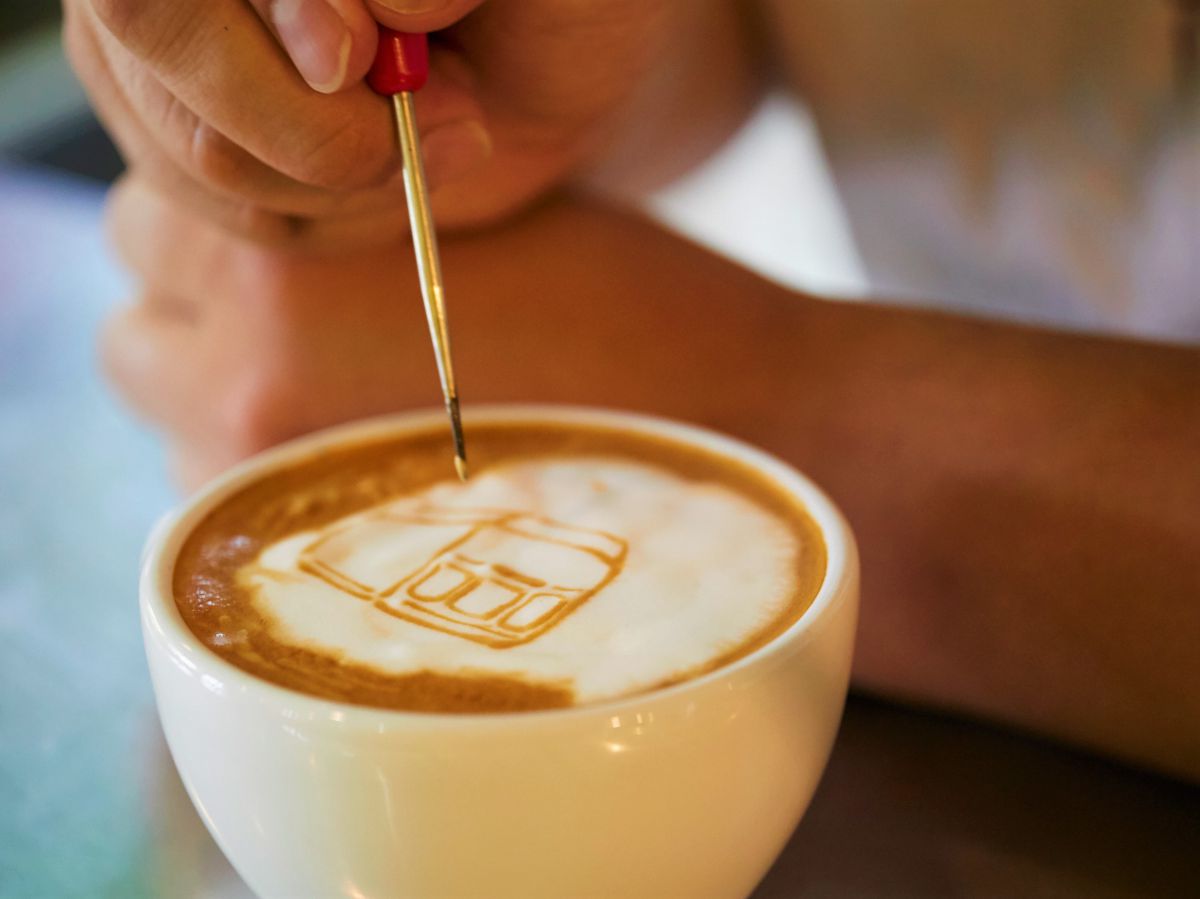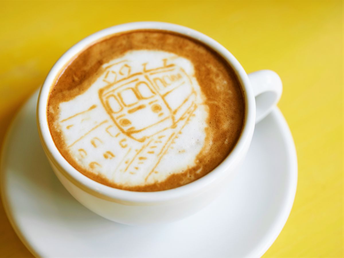 躍動的な“江ノ電”の完成です!どのラテアートも味のクオリティーを下げることなく提供したいとの思いから、牛乳を注いだ瞬間から5分以内で描き終えることを目安にしているそうです。