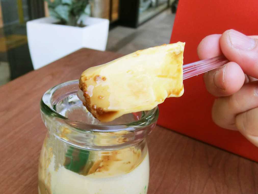 「浅草まるごとにっぽん」の館内外にはイートインスペースがあるので、さっそくいただきます。スプーンですくった感じはしっかりしていますが、口に入れると卵の香りとともにさらーっとなくなる軽やかさ!