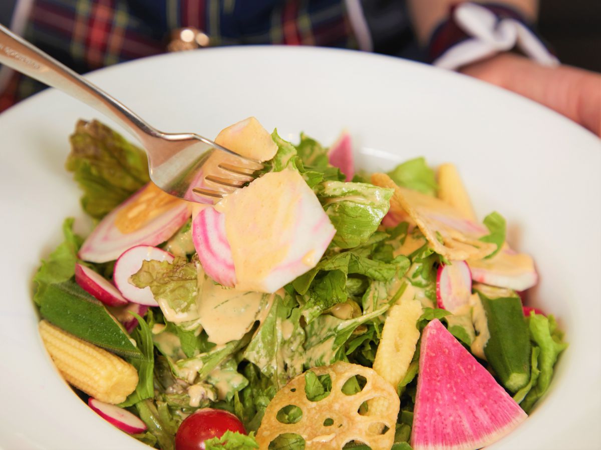 「Saxe Bleu Diner」では、お肉だけでなくサラダも人気なんです!全3種のサラダのうち、もえあずのイチオシは、季節の野菜がモリモリと約10種類も入った、見た目も鮮やかな「季節野菜の彩りサラダ」。旬の素材がたっぷり味わえるだけでなく、アンチョビを使ったこのオリジナルドレッシングが大きなポイントに!