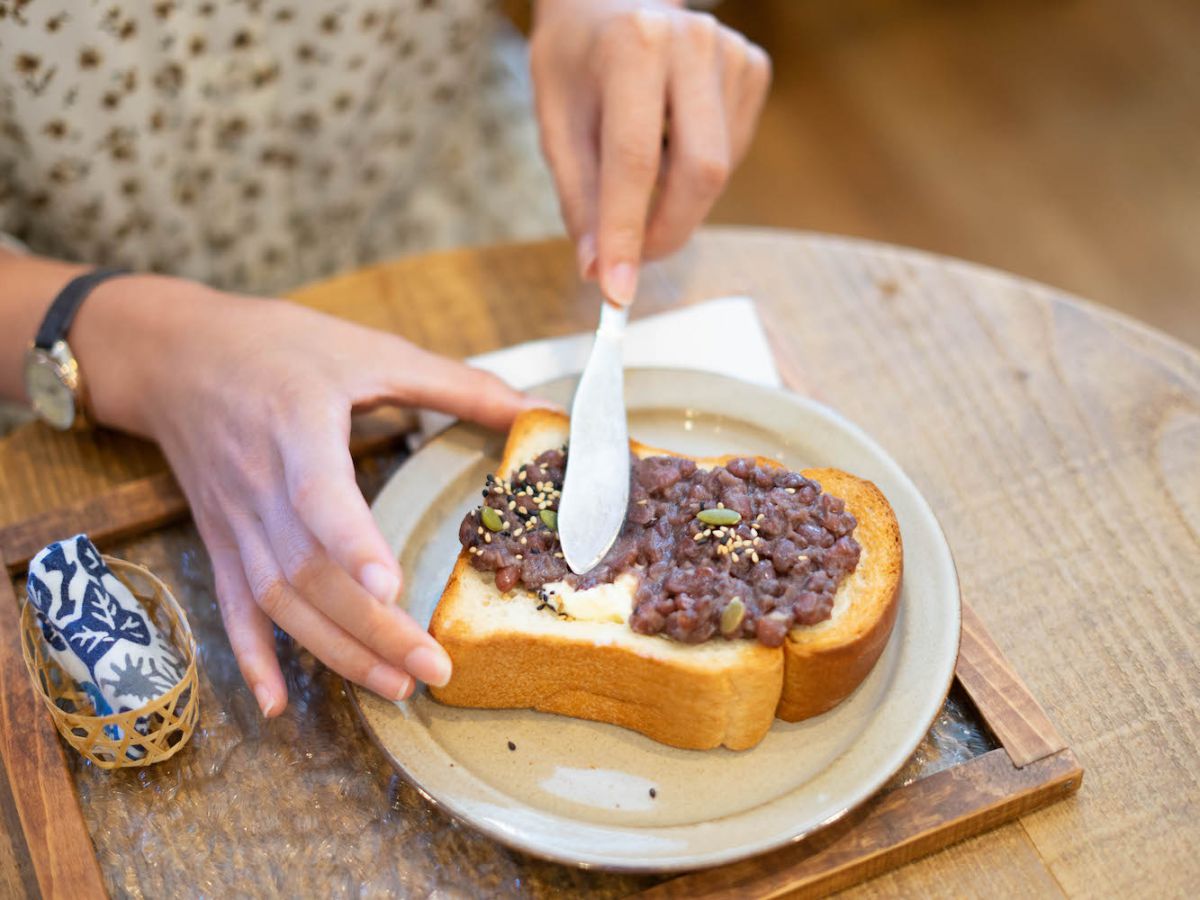 自家製あんこのやさしい甘みと、米粉パンのもっちり&しっとり食感が絶品!北海道十勝産の無農薬無化学肥料の自家焙煎の小豆を使い、きび砂糖で炊いて作った自家製のあんこは、大粒ながらも後に残らずとってもなめらか。ホイップバターのふわっとした食感とコクが、トースト全体を深い味わいにしてくれます。