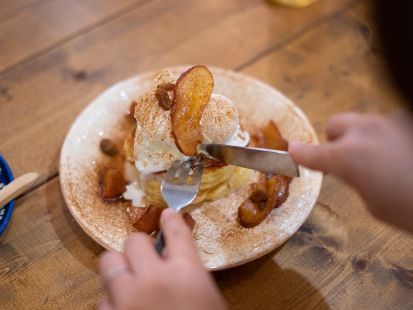 焼きりんごの甘さとシナモンは相性抜群。焼きたてのパンケーキとひんやり冷たいバニラアイスが、口の中でゆっくりとろけます。焼きりんごがキャラメリゼされてカリカリになっているところも、パンケーキの美味しさを引き立てているポイント!