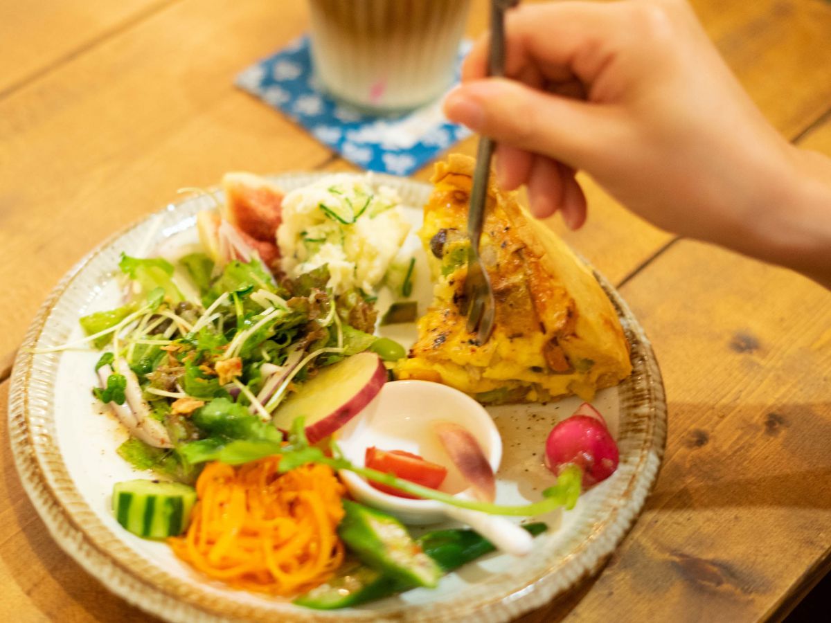 ランチにぴったりなのが「キッシュプレート」。器にはボリュームたっぷりの野菜とキッシュ。彩り豊かな野菜は、ビジュアル通りみずみずしくてとっても美味しい!それもそのはず、こちらのサラダは店主のお父様が作られている自家栽培の野菜を、なるべくたくさん使っているそうです。