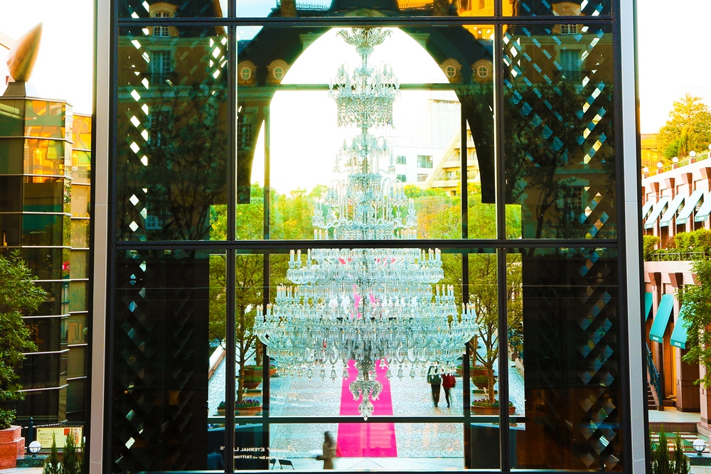 今回の目玉のひとつである「Baccarat ETERNAL LIGHTS-歓びのかたち-」で展示されるバカラシャンデリア。⾼さ約5m、幅約3m、クリスタルパーツ総数8500ピース、ライト総数250灯の世界最⼤級の規模を誇ります。