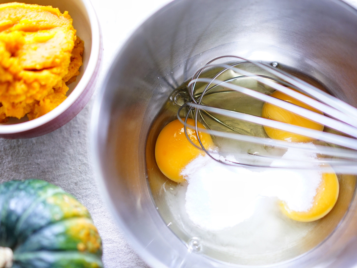 よく混ざったら、裏ごししたかぼちゃを少しずつ加えて、その都度混ぜます。