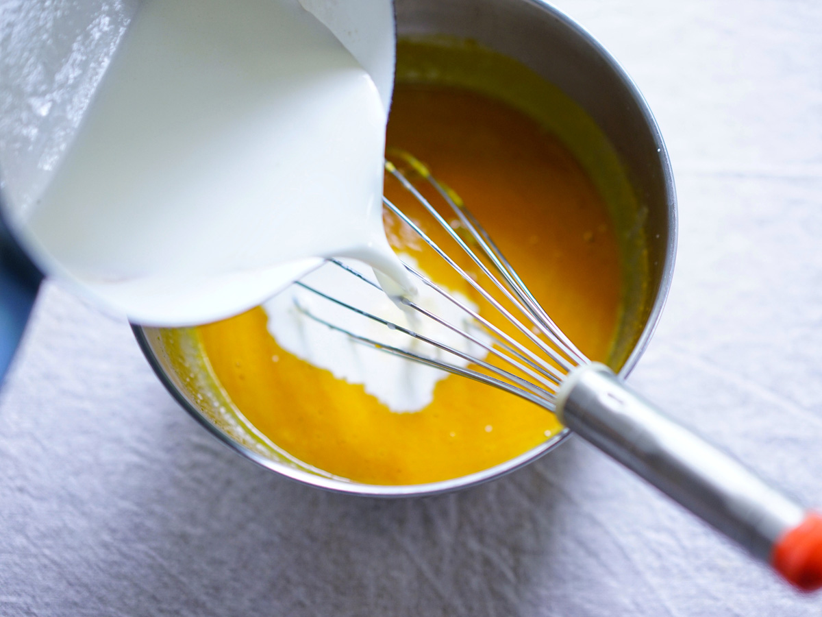小鍋に、牛乳と生クリームを入れ、鍋のまわりがふつふつするまで温めます。②のボウルに少しずつ加え、その都度かき混ぜます。