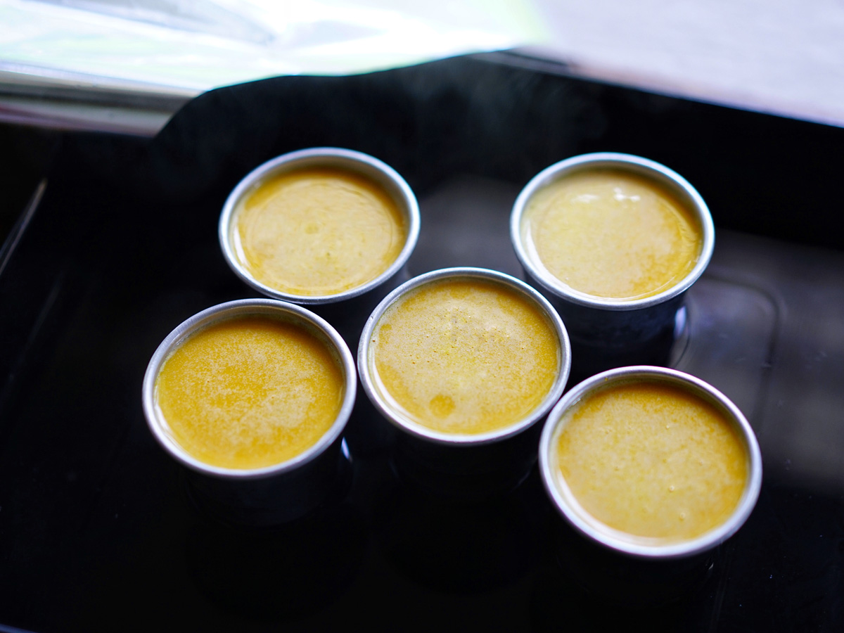 茶こしでこしながら、プリンカップに等分に流し入れ、アルミホイルをかぶせます。
